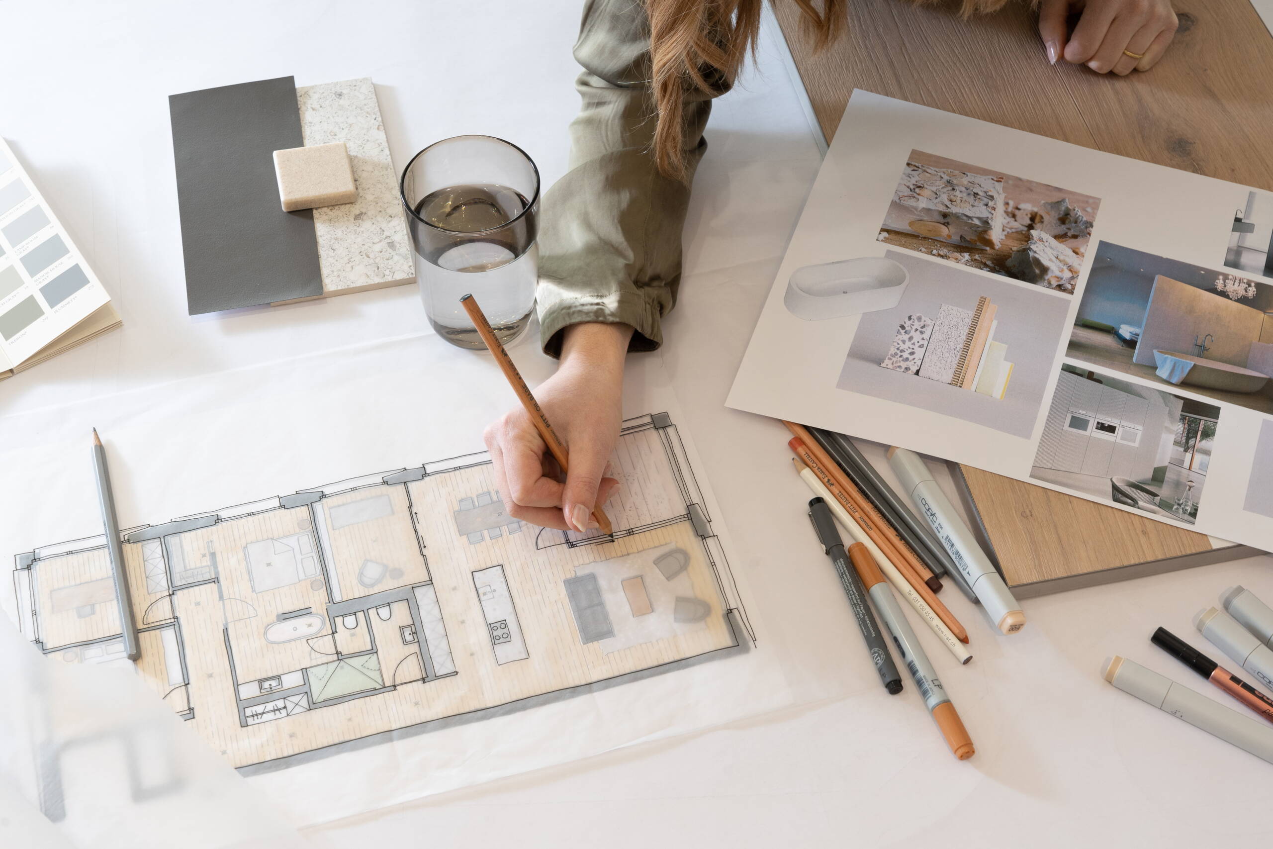 Gemeinsam besprechen wir den Grundrissplan Ihrer Wohnung, klären die möglichen Anpassungs- sowie Änderungsmöglichkeiten und beraten Sie bei der Materialwahl für den Innenausbau.